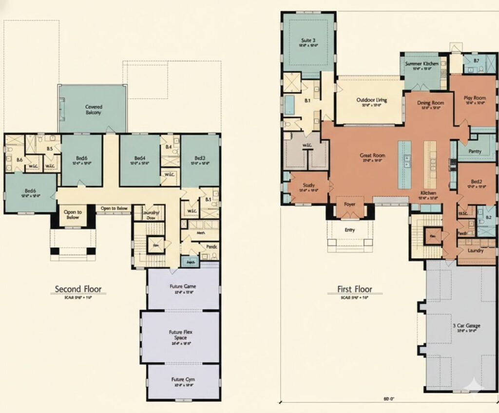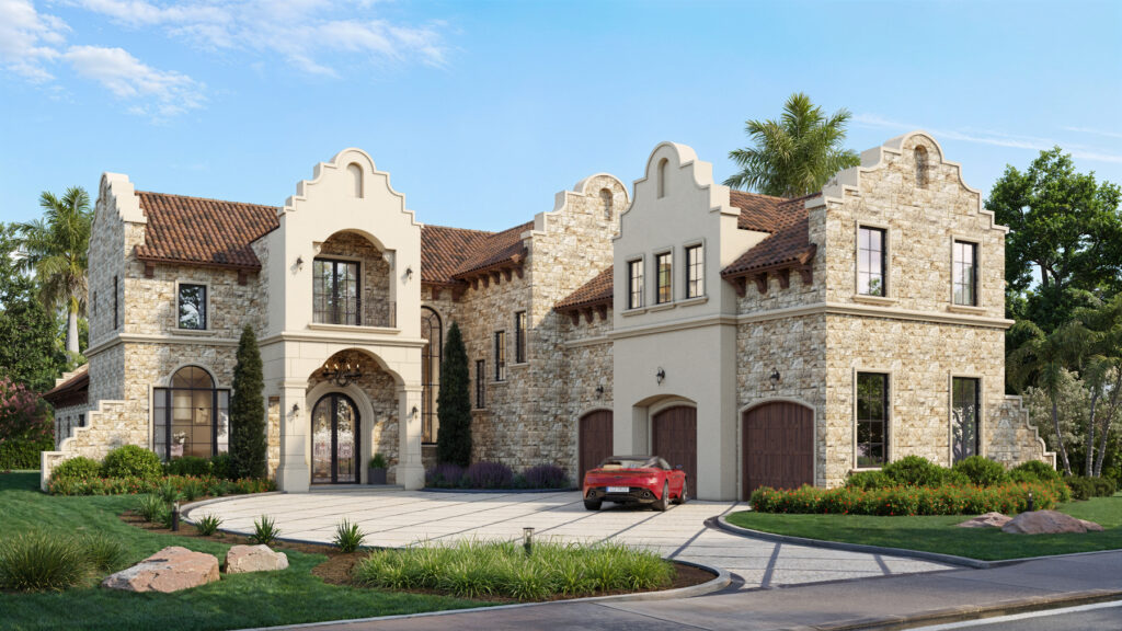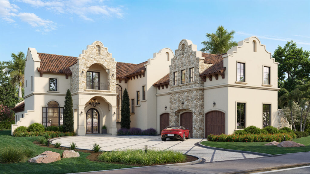 Mission Oaks offers the elegant combination of privacy and entertainment. The extra-large great room opens up to a spacious outdoor living area. The large kitchen area boasts a double island and a spacious pantry. The adjacent Dining Room opens up to the summer kitchen and has room for a large gathering table. The extra-large owner’s suite overlooks the pool area. First floor also has a Study/Den and a Playroom which can be converted into an extra badroom which has a private bath that can be used as the pool bath. You can access the private ensuite guest rooms upstairs via the optional elevator. The upstairs also has the option of a covered balcony and a theater, gym, and game room over the three-car garage.